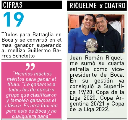 Battaglia, con una extensa trayectoria como jugador en el conjunto de La Ribera, alzó 17 trofeos y, ya en su nuevo rol como DT, cosechó dos campeonatos más en su estadía en la institución, donde es se coronó al vencer 3 a 0 a Tigre.