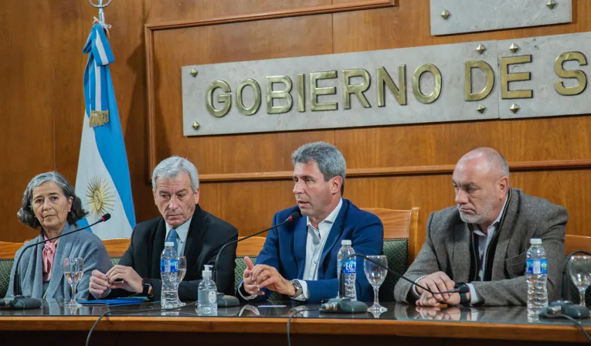 Tras la presentación, el gobernador Uñac destacó la construcción de los diques y la inversión que realizó San Juan a lo largo de los años en materia de agua potable, cloacas, canales, entre otras.