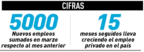 Los datos relevados por el Ministerio de Trabajo muestran que en el mes de marzo se generaron 20.796 puestos de trabajo registrados en el sector privado, lo cual implica un 0,3% de crecimiento con respecto al mes previo. Ya son 15 meses de crecimiento neto del empleo privado.