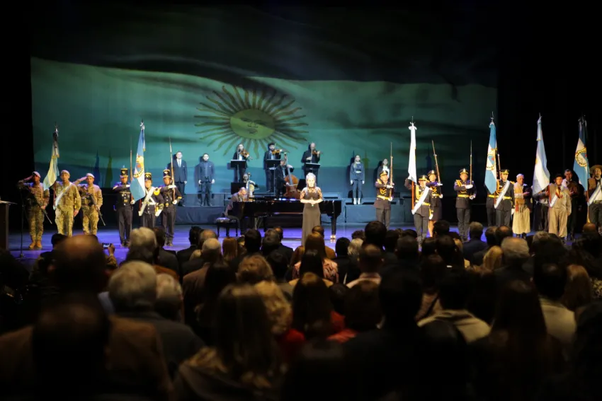 El Himno Nacional lo interpretó la cantante Melisa Quiroga, acompañada por Lucio Flores y la Camerata San Juan.