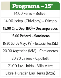 Por su parte, el Víbora debe apostar a la recuperación de manera urgente para salir de la zona del descenso. Después de la ida del DT Islas no ha tenido horas sencillas, por lo que todo es cuesta arriba. A las 15.00 visita a Círculo Deportivo en Otamendi. El entrenador del equipo sanjuanino, que viene de perder como local ante Argentino de Monte Maíz, será Juan José Corzo, quien lo hará de manera interina. El juez del cotejo será Joaquín Gil de la localidad de San Pedro.