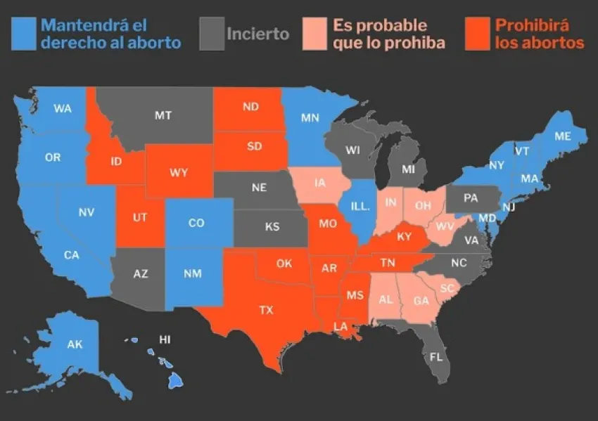 A continuación, la lista con los estados en los que la prohibición del aborto entrará en vigor en meses, aquellos donde el destino es incierto y otros en donde seguramente el derecho seguirá protegido.