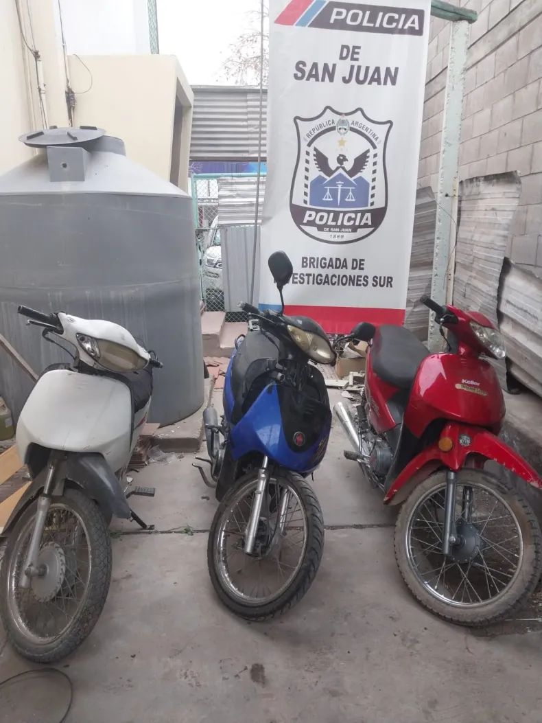 Como resultado de dichos operativos lograron el secuestro de varios efectos productos de ilícitos, entre ellos tres motos de 110 cc, una marca keller, dominio A060QGX, color roja, sustraída en el departamento Rawson; una Gilera smash, color azul, sustraída en Comisaria Tercera, en el mes de mayo; y una tercera en la que se esta trabajando para identificar, en virtud de que fue armada con varias partes de diferentes motos.