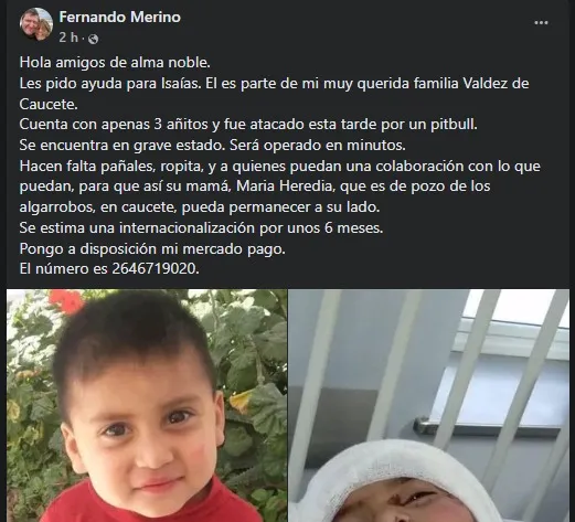 El usuario de Facebook Fernando Merino, publicó un pedido de ayuda para el nene atacado que es su pariente. "Se encuentra en grave estado. Será operado en minutos", dijo durante la tarde de este jueves. "Hacen falta pañales, ropita, y a quienes puedan una colaboración con lo que puedan, para que así su mamá, Maria Heredia, que es de pozo de los algarrobos, en Caucete, pueda permanecer a su lado", señaló.