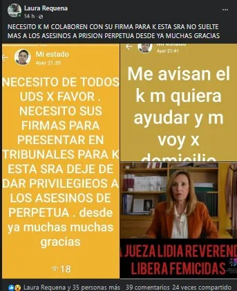 Laura requena no es la unica que forma parte de esta iniciativa. Mujeres de la Matria Latinoamericana (Mumalá) también reúne firmas para pedirla destitución o renuncia de Reverendo. Según la agrupación, la magistrada beneficia con sus resoluciones a femicidas y violentos que ya están condenados por sus crímenes a reclusión perpetua. Además de las peticiones, solicitaron una reunión con Adriana García Nieto, ministra de la Corte de Justicia de San Juan.