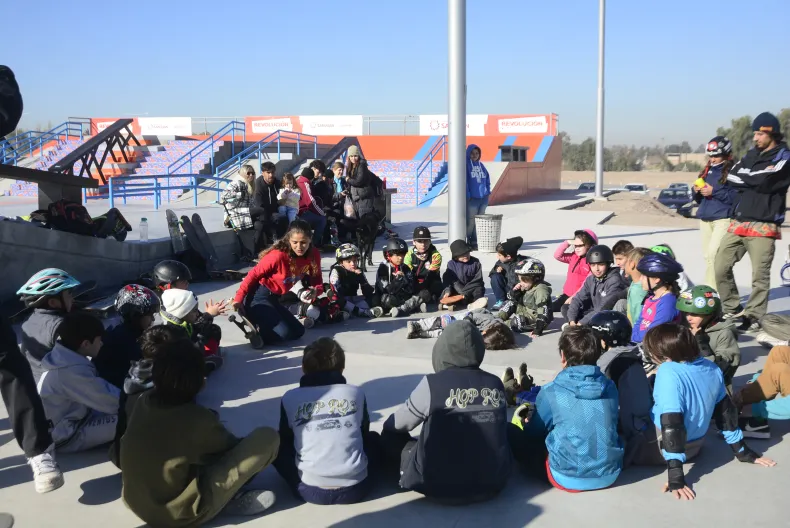 Con la presencia de una importante cantidad de chicos de todas las edades y de algunos no tan chicos, se lleva a cabo la clínica de Skate, a cargo de la profesora Paula Videla que tiene como punto de reunión la flamante pista construida detrás del estadio San Juan del Bicentenario de la Ciudad Deportiva del departamento Pocito.