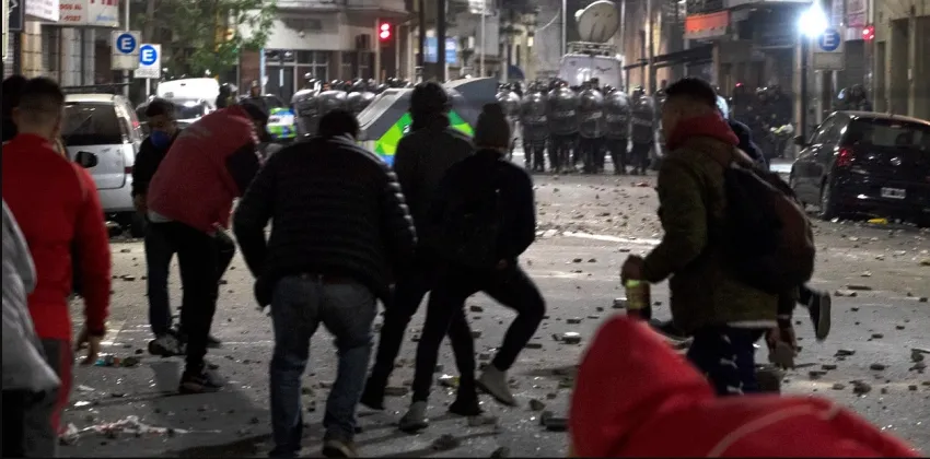 La batalla campal, duró casi una hora y la Policía fue atacada a pedradas y golpes por hinchas del "Rojo", que también provocaron algunos pequeños incendios y rompieron varios autos y carteles en la vía pública.