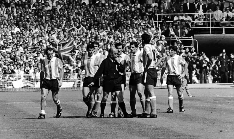 La protesta argentina que originó las tarjetas en el fútbol. Ese día la Albiceleste enfrentó al dueño de casa en Wembley por los cuartos de final de la Copa del Mundo que se jugó en Inglaterra. Un confuso incidente entre Antonio Rattín y el árbitro motivó la creación de la Roja y la Amarilla.