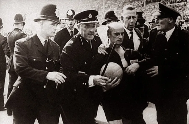 El alemán se retira de la cancha secundado por la policía inglesa.