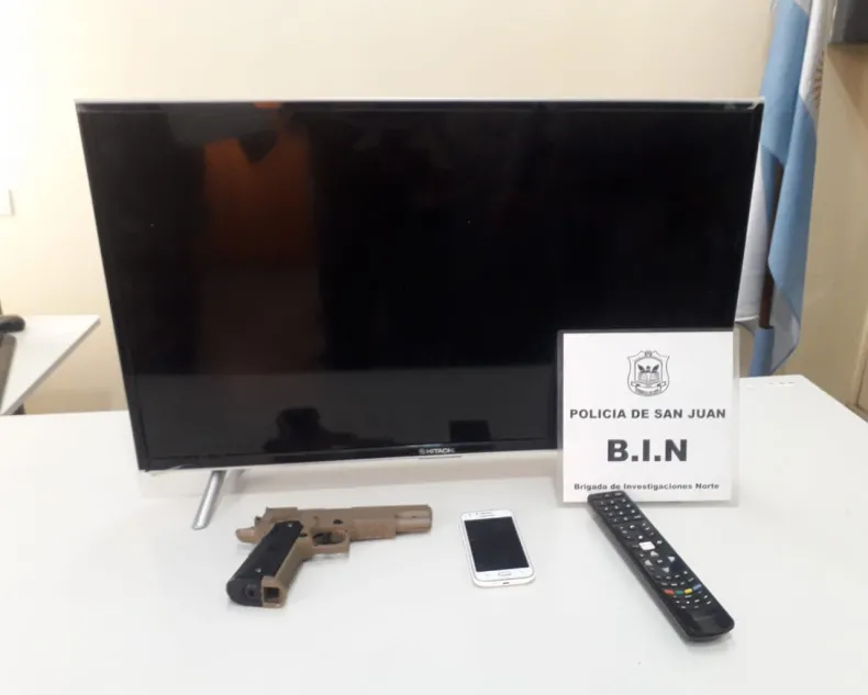 Atento a lo expresado, la Brigada Norte llevó a cabo el allanamiento de rigor en el Barrio UPCN, de Chimbas, ordenado por el 3º Juzgado de Instrucción. Se detuvo a un ciudadano mayor de edad y se procedió al secuestro del televisor Hitachi de 32", la pistola de aire comprimido, un control remoto, y telefonía móvil propiedad de este sujeto.