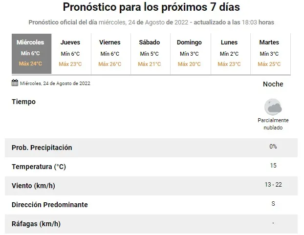 era de 24°, una temperatura primaveral. Mientras que, para el viernes, se espera el marcador llegue hasta los 23° y el viernes, aumentará más, hasta los 26°. En tanto que, para el sábado y el domingo, se espera que baje la máxima quede en 21° y 20°.