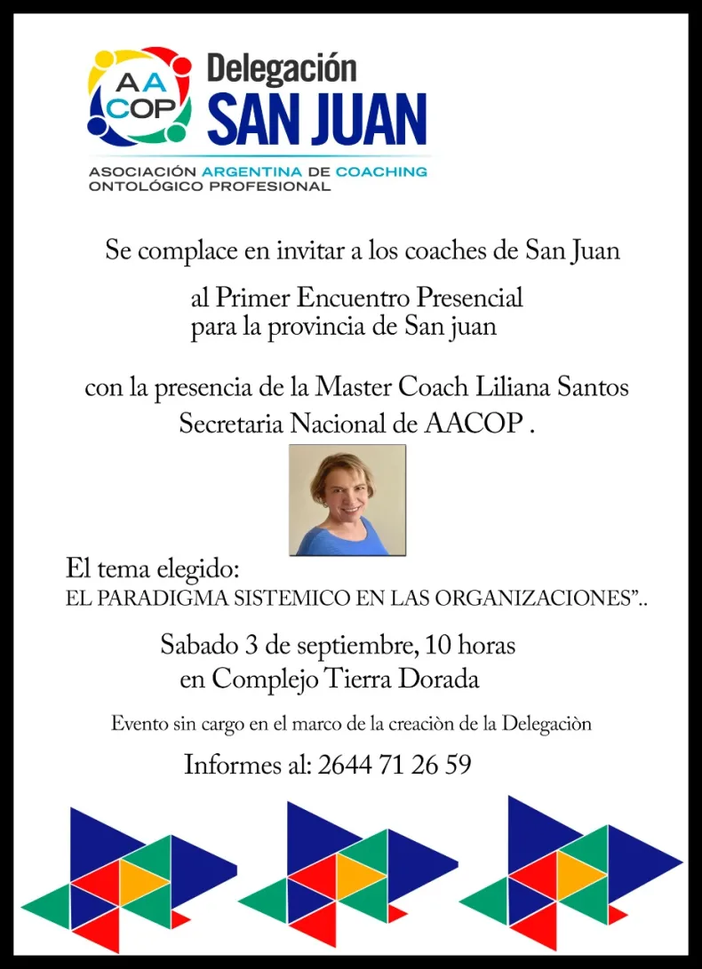 La flamante Delegación San Juan de AACOP informa que el próximo 3 de septiembre se realiza un encuentro en nuestra provincia. Contará con la visita de la secretaria nacional, la master coach Lili Santos, profesional con una amplia y reconocida trayectoria en la Argentina.