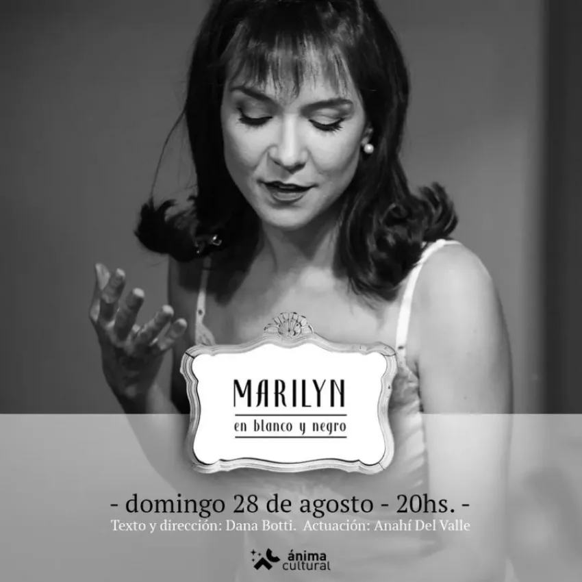 La obra "Marilyn en blanco y negro" sube al escenario de Ánima Cultural esta noche desde las 20 hs. en Ánima Cultural, Gral. Paz 1157 oeste, entre Urquiza y Segundino Navarro, con la actuación de Anahí del Valle y el texto y dirección de Dana Botti.