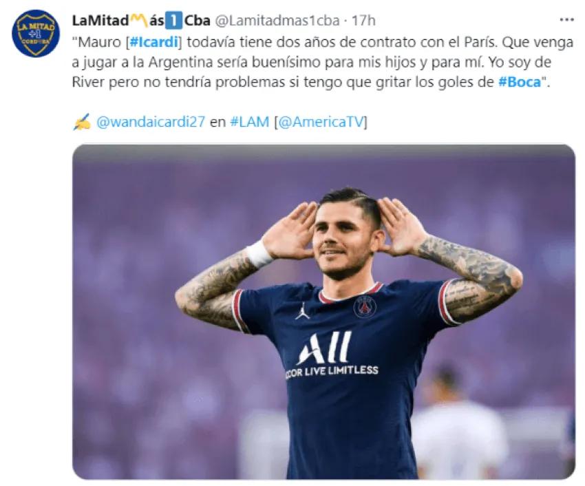 Al aire de LAM y sin pelos en la lengua, Wanda Nara habló del futuro de Icardi: "Puede ser que juegue en Argentina, a mí me encantaría. Mis hijos y mi marido son la parte europea, yo soy la parte argentina de la familia". Y sumó pensando en el Xeneize: "Yo soy de River, pero donde sea. Si tiene que jugar en Boca gritaré también los goles".