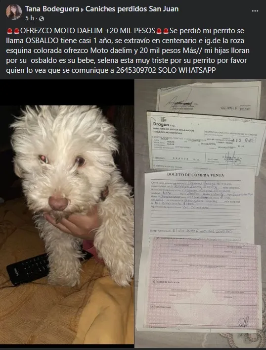 El perro es el mejor amigo del hombre, dice la famosa frases. Es que hay familias donde los perros son una clave para la felicidad de niños y adultos. El problema, es que cuando se pierden o se escapan, cuesta mucho superar esa pérdida. En la provincia hay famosos casos de personas que ofrecieron mucho dinero para recuperar a sus mascotas. En este caso, una mujer no solo ofrece una jugosa suma de dinero, sino que también una motocicleta.