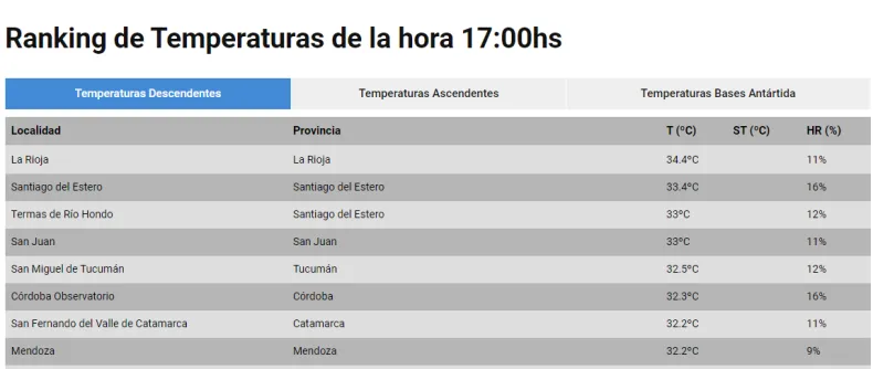 Las provincias de La Rioja con 34.4°C y de Santiago del Estero son las primeras dos. La última ubicó a dos localidades, Termas de Río Hondo y Capital con 33° y 33.4°C, respectivamente.