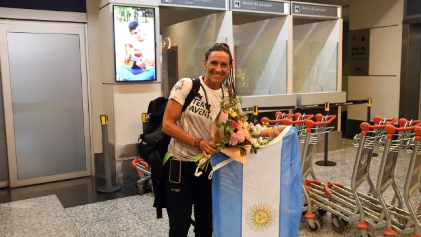 En el Aeropuerto El Plumerillo la esperaban sus familiares, amigos y el equipo del Team Aventura con el que entrena, y la deportista tenía desplegadas entre su equipaje algunas de las banderas que la acompañaron en esta proeza.