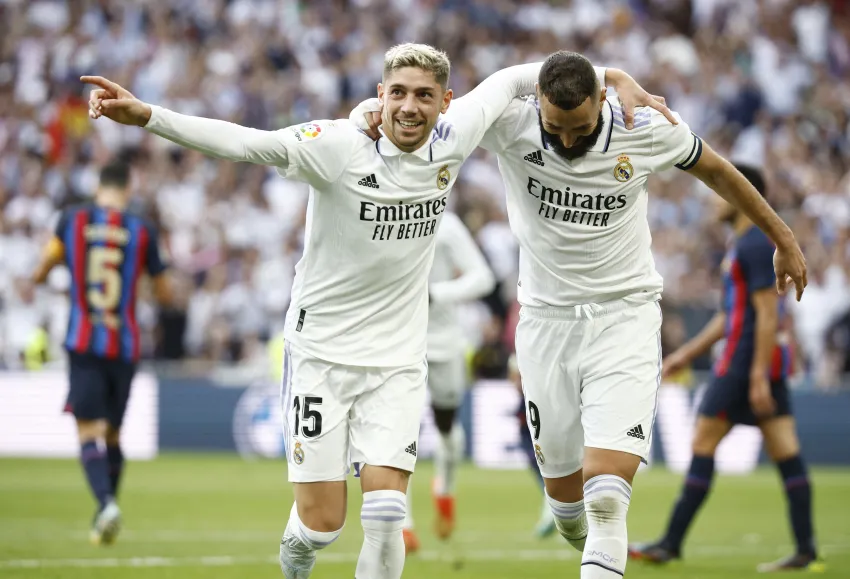 El conjunto madrileño le dio un nuevo golpe al equipo catgalán con goles de Karim Benzema y el uruguayo Federico Valverde a los 12 y 35 minutos de la etapa inicial, respectivamente.