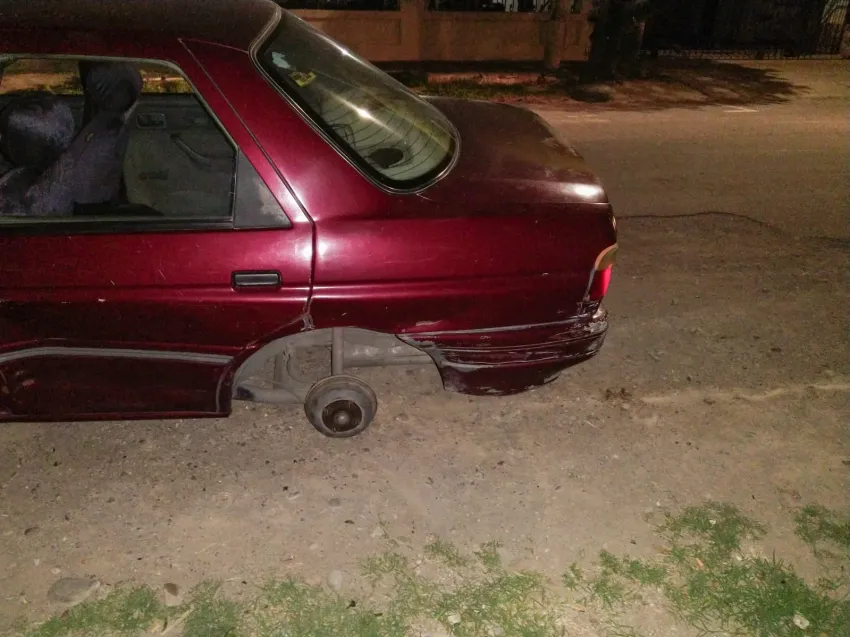 "Subí a mi auto, un Ford Orion de color bordo, y arranqué. Cuando quise salir del lugar donde estaba estacionado me di cuenta que no podía. Me bajé y vi que no tenía la rueda del costado izquierdo de atrás", agrega.