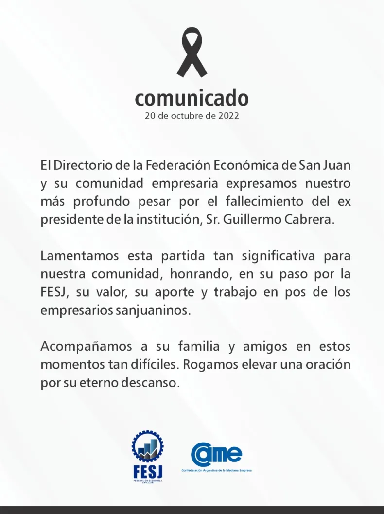 Este jueves 20 de octubre, por la tarde, se confirmó el fallecimiento de Guillermo Cabrera quien supo ser un histórico dirigente de la CAME en San Juan. Cabrera, de 67 años, quien se desempeñó como presidente sanjuanino y referente regional de la confederación.