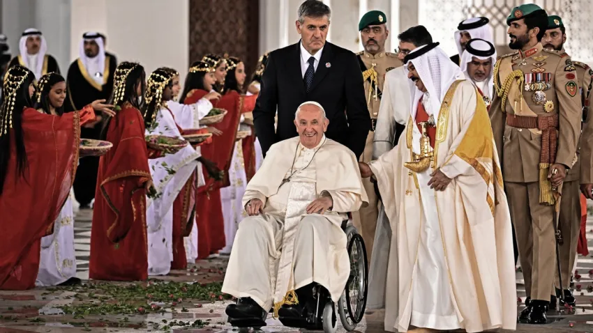 El Pontífice llegó este jueves a Bahréin desde Roma para una visita de cuatro días centrada en su participación en un foro interreligioso, en reuniones con autoridades musulmanas y en encuentros con la pequeña comunidad católica local, durante la que estará acompañado por un enviado de Télam.