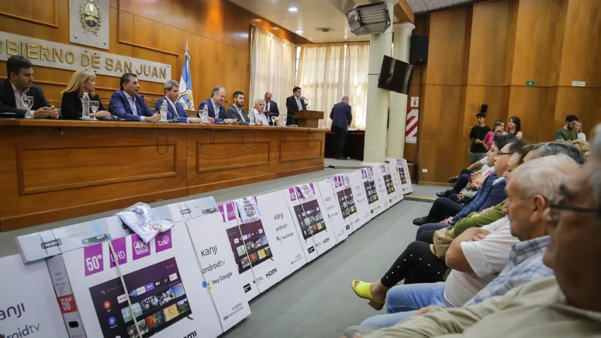 El Gobierno Provincial entregó más de 100 televisores a centros de jubilados, iniciativa que tiene como objetivo estimular la sociabilidad de los adultos mayores. El acto se desarrolló en Casa de Gobierno y fue encabezado por el gobernador Sergio Uñac y el ministro de Desarrollo Humano, Fabián Aballay.