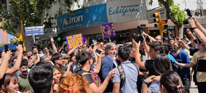 Luego de la conferencia en el salón del Club Social en frente de la plaza 25 de Mayo en la que se encontraba acompañado por sus representantes en San Juan, Javier Milei recorre la peatonal rodeado de simpatizantes.