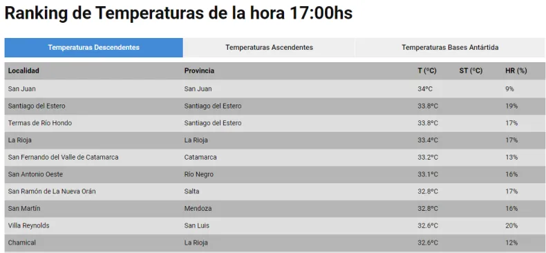 Con 34ºC nuestra Ciudad de San Juan lidera el podio, por encima de la capital de Santiago del Estero y su localidad de Termas de Río Hondo.