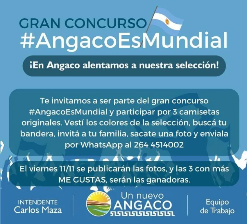 La idea de la intendencia que encabeza Carlos Maza es que los interesados en participar del concurso se vistan con los colores del equipo que dirige Scaloni y posen con la bandera argentina, junto a su familia o amigos, listos para alentar a la Selección Argentina. Las fotos deberán ser enviadas al 2644514002 hasta el 11 de noviembre.