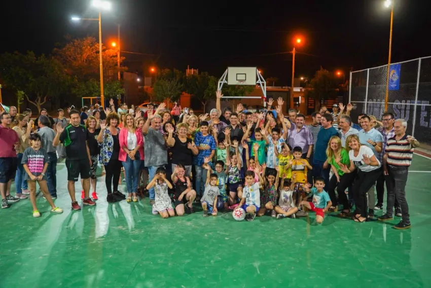 El Intendente Juan José Orrego, en compañía del equipo municipal de Santa Lucía y muchos vecinos que se acercaron a conocer su nuevo multiespacio, inauguró el playón deportivo en el barrio AOMA SUTERYH. Se trata de un predio recuperado que cuenta con canchas con pintura de alto impacto, aros y arcos para