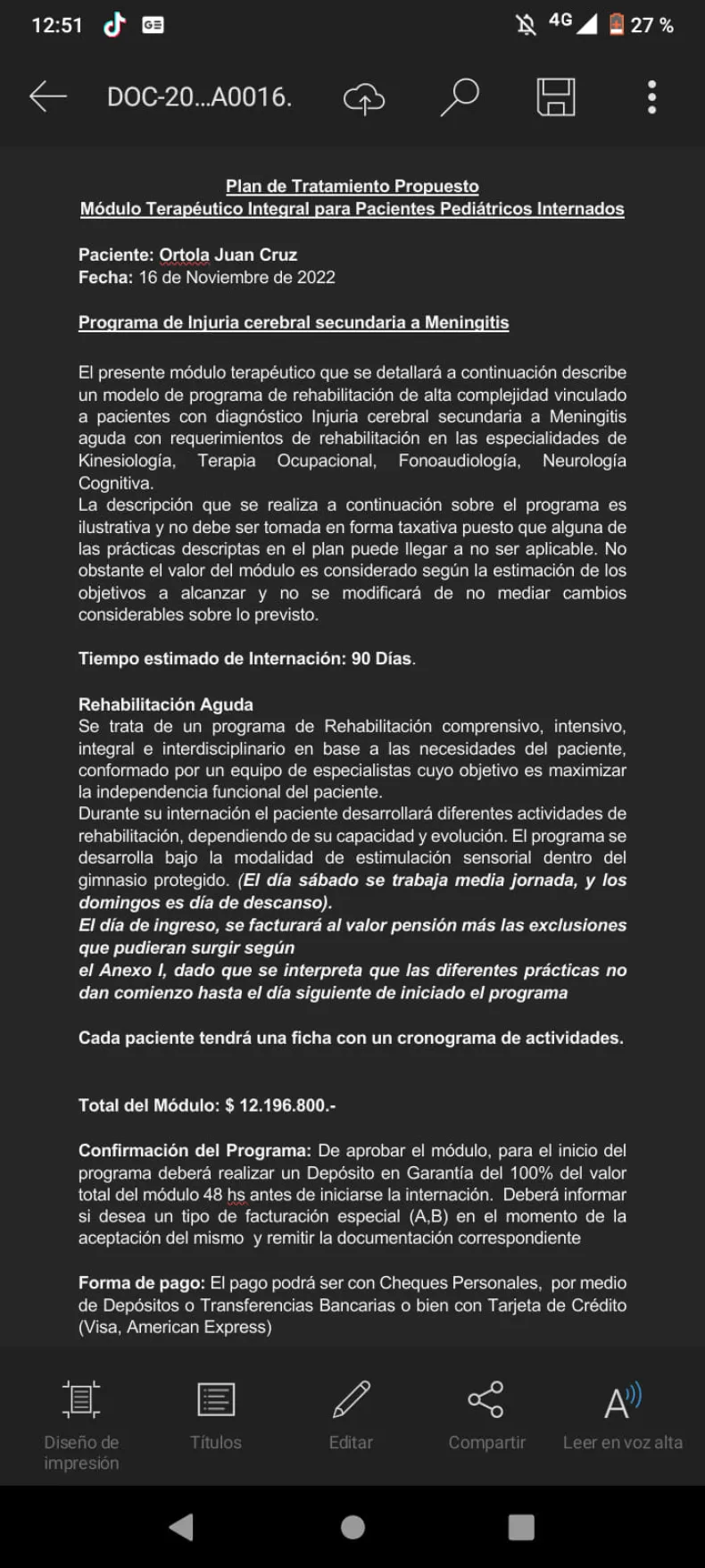 "El necesita neurorehabilitación y acá en San Juan no hay, hay en Buenos Aires. Él debe ir a hacer ese tratamiento que tiene a 8 especialistas dedicados solo a tratarlo. Sale 12 millones 200 mil pesos". Si bien la familia de Juan Cruz tiene Obra Social Provincia (OSP), afirma que hay gastos que no se cubren. "Necesito que esos expedientes que se han generado en la OSP porque en 20 días tengo que confirmar el turno del gordito. Con los de la OSP y con lo que juntemos, debemos confirmarlo en 20 días, porque aumenta el costo y mi hijo se puede quedar sin el tratamiento".