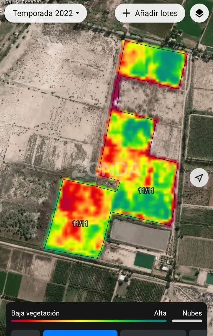 El especialista sostiene que en estos tiempos se tienen que optimizar la calidad del riego. Es por ello que entre otras cosas se tiene que echar mano a cuanto sea posible. Por ello, la utilización de tecnologías complementarias para el análisis también es viables. La imagen muestra el estado del cultivo, por periodos y a partir de ello podemos saber dónde hay que aportar más o menos nutrientes y dónde hay que regar más o menos.