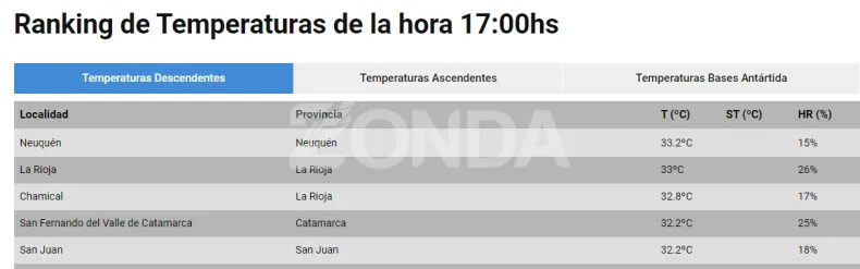 Con más de la máxima esperada para hoy, San Juan ocupa el quinto puesto de las ciudades más calurosas de la Argentina. Con 32.2ºC, cuando se esperaban solo 31ºC, nuestra provincia se posiciona, una vez más, en el Ranking de temperaturas ascendentes, del Servicio Meteorológico Nacional.