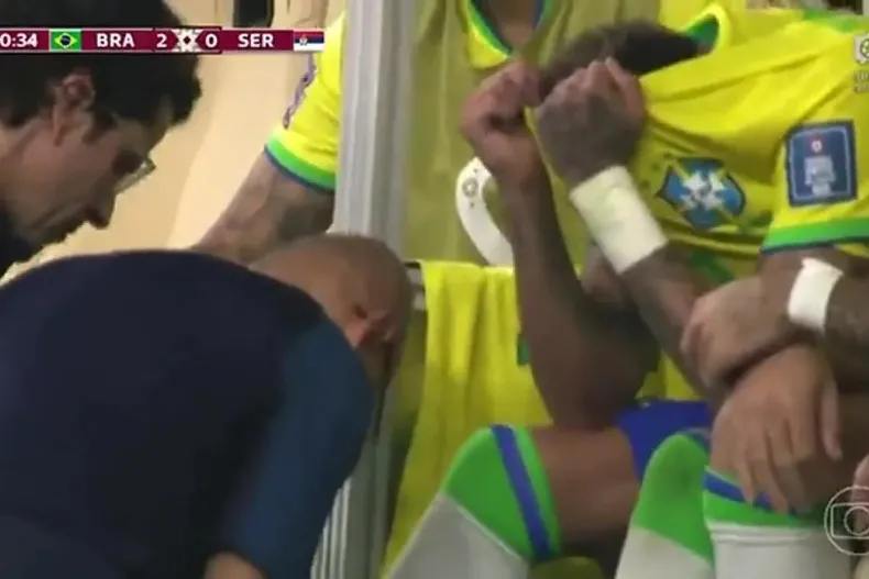 La televisión brasileña mostró cómo lloraba y después se tapaba la cara con la camiseta mientras los médicos del plantel le hacían un vendaje en el tobillo derecho. Neymar salió del campo en el minuto 79, reemplazado por Antony. Él mismo pidió el cambio, cuando el partido ya parecía definido. Apenas se sentó le pusieron hielo y empezó a mostrar gestos de sufrimiento.