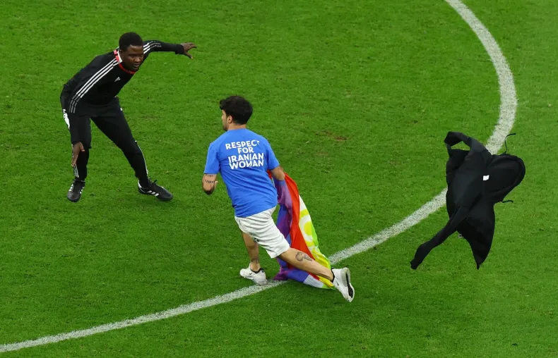 En pleno partido entre Portugal y Uruguay, por el Grupo H del Mundial, se vivieron momentos de tensión. Fue por un hincha que invadió el campo de juego, con reclamos por la ideología y régimen de Qatar e Irán. Ingresó con una bandera de la comunidad LGBTIQ+ y con una leyenda en su remera, respecto a la situación que afrontan las mujeres iraníes.