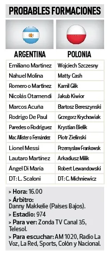 La Selección Argentina enfrenta a las 16.00 a Polonia en el cierre del grupo C y necesita ganar para clasificar a octavos de final. Con el empate debe esperar el resultado de Arabia con México.