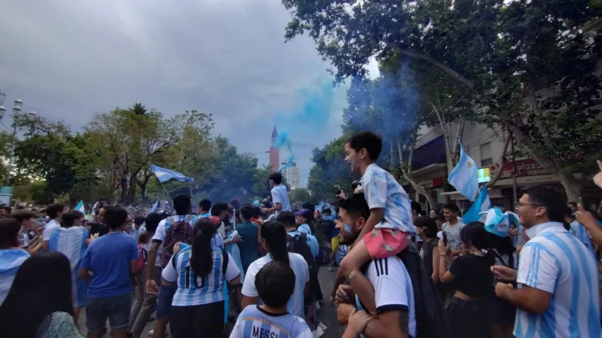 Los sanjuaninos dan rienda suelta a su alegría por el triunfo de la selección argentina ante Australia en el Mundial de Qatar 2022. Todos se concentran en la Plaza 25 de Mayo, portando camisetas celestes y blancas.