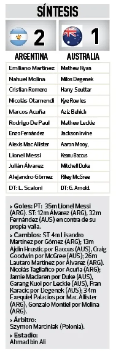 Argentina se clasificó a cuartos de final al vencer a Australia 2 a 1. Lo ganaba tranquilo con los goles de Messi y Julián Alvarez pero el descuento australiano estiró la angustia hasta el final con una tapada increíble del Dibu Martinez.