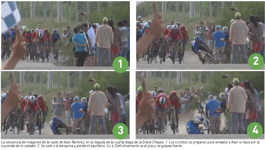 La llegada se daba en la Avenida de los Ríos, cerca de la intersección con Ruta 270, en Caucete. A pocos metros del final, cuando una quincena de hombres iban lanzados para el sprint, Alan Ramírez se ubicaba por la izquierda de la calzada, junto a los piqueteros de la Agrupación Virgen de Fátima, Gerardo Tivani y Vladimir Martínez. Pero el de Rawson se fue a la banquina y cuando quiso retomar el asfalto no pudo mantener la vertical.