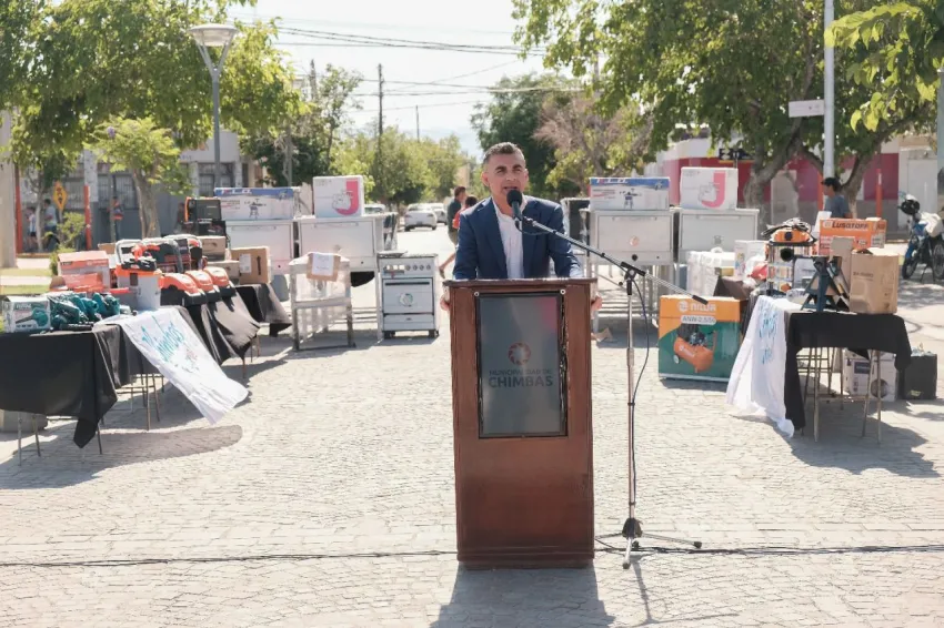 El intendente de Chimbas, Fabián Gramajo, entregó equipamiento a los beneficiarios del Banco de Maquinarias, Herramientas y Materiales, que es un programa del Ministerio de Desarrollo Social de la Nación que consiste en la entrega de subsidios no reintegrables a organismos gubernamentales y organizaciones de la sociedad civil, con la finalidad exclusiva de ser destinados a la compra de maquinarias, herramientas y materiales, brindando asistencia técnica y capacitación en las instancias de formulación, ejecución, y acompañamiento de los proyectos.