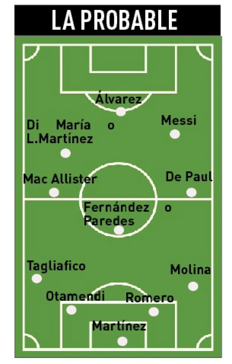 No obstante, Scaloni mantiene dudas para conformar el equipo. El regreso de Di María podría significar la salida de Lisandro Martínez y el consecuente cambio de esquema.