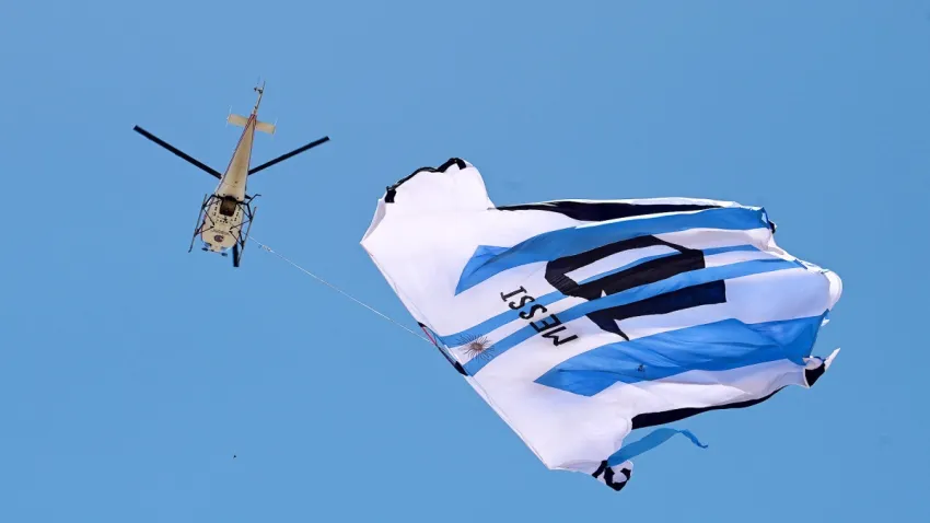 Una enorme camiseta celeste y blanca del astro del fútbol mundial, Lionel Messi, catalogada como "la más grande del mundo", apareció este martes al mediodía elevada por un helicóptero y flameando en el cielo de la costa de Rosario, para alentar a la selección en la previa de la semifinal contra Croacia.