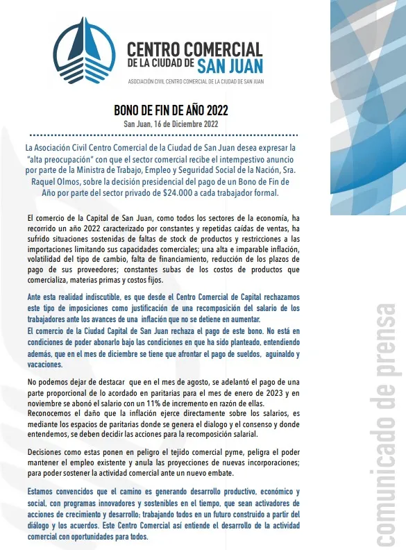El Centro Comercial de la Ciudad de San Juan rechaza el pago del bono de $24.000 que anunció el gobierno nacional para los trabajadores privados en relación de dependencia, a pagarse en un solo tramo en diciembre.