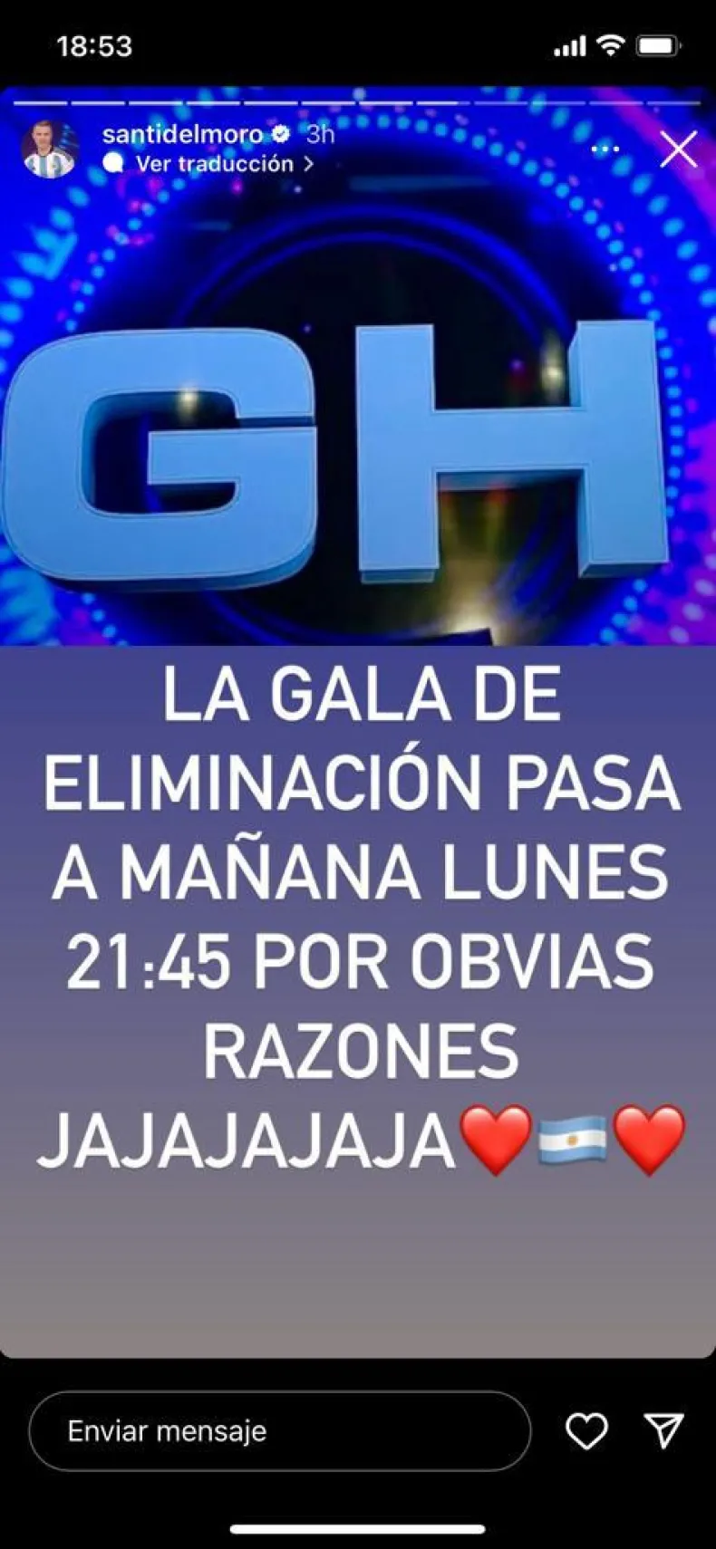 "La gala de eliminación pasa a mañana lunes a las 21:45 por obvias razones", escribió el conductor del ciclo.