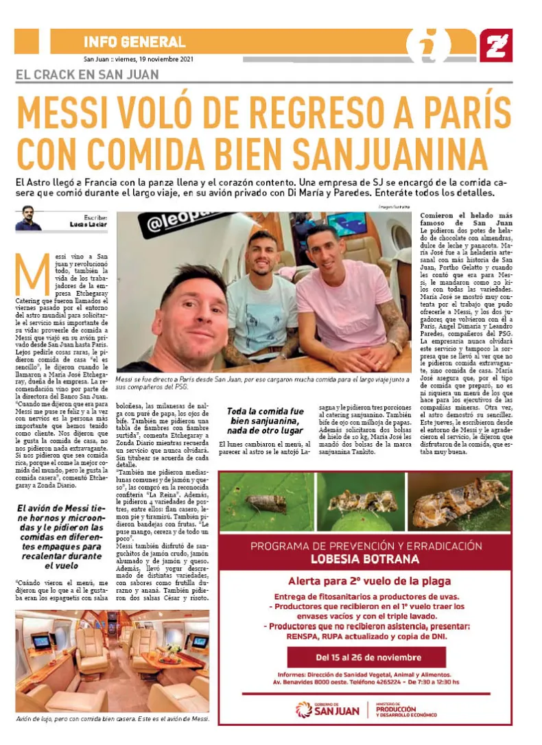 Ese día Messi no se volvió con toda la selección para Buenos Aires. Sino que junto a sus compañeros del PSG, volvió a Paris en su avión privado. En ese viaje comieron comida sanjuanina y este hecho marcó a los trabajadores la empresa Etchegaray Catering que les prestaron servicio. En ese momento, Zonda Diario contó la historia.