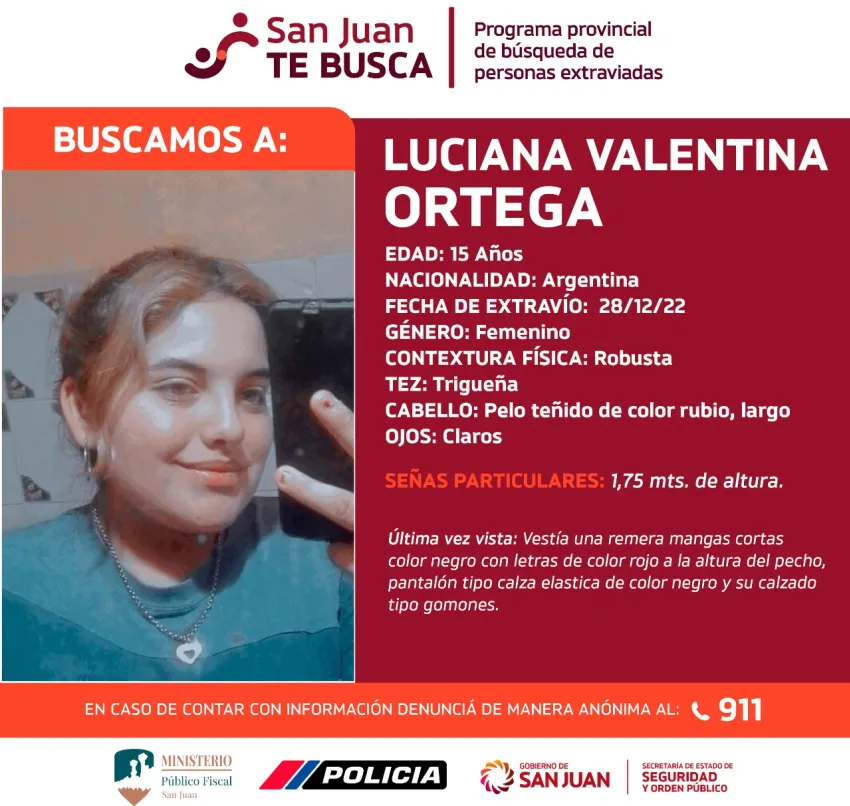 La Policía de San Juan, no deja lugar sin buscar para dar con el paradero de la menor Luciana Valentina Ortega de 15 años, quien salió de su casa el pasado 28 del corriente y hasta el momento nada se sabe sobre su ubicación.