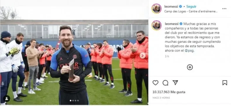 En sus redes sociales, Messi escribió: "Muchas gracias a mis compañeros y a todas las personas del club por el recibimiento que me dieron. Ya estamos de regreso y con muchas ganas de seguir cumpliendo los objetivos de esta temporada, ahora con el PSG".