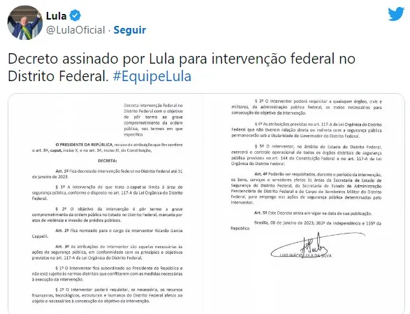 . La intervención durará hasta el 31 de enero de 2023 y será liderada por el secretario general del Ministerio de Justicia, Ricardo Capelli, quien ha sido nombrado como interventor y estará directamente subordinado al presidente. Capelli será el encargado de controlar y supervisar todos los órganos de policía de la capital y solo responderá ante Lula. Esta medida se ha tomado mientras el presidente se encuentra de visita en el estado de Sao Paulo.
