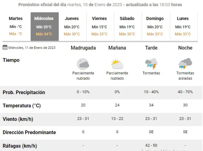 El Servicio Meteorológico Nacional, anuncia para este miércoles, una temperatura mínima de 20 grados y una máxima de 34 grados. Durante la jornada se espera que el cielo este mayormente nublado con viento del sector sur a razón de 13 a 22 kilómetros en la hora.