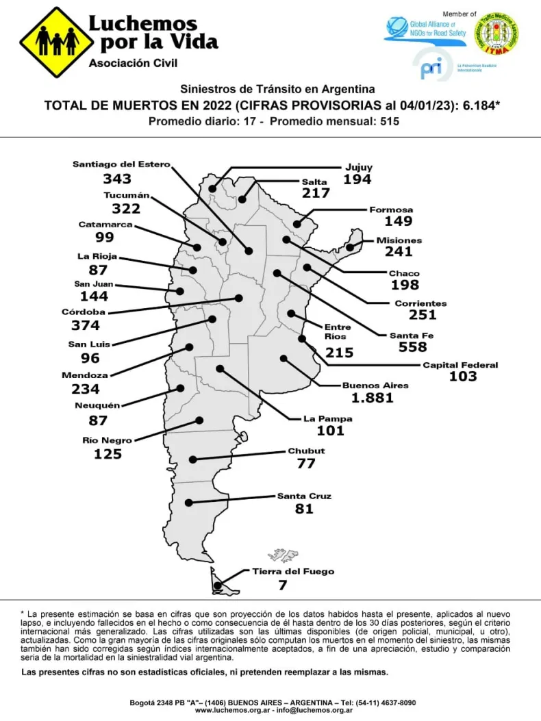 Familias del Dolor compartió en su cuenta de Facebook una imagen de Luchemos por la Vida, con estadísticas que duelen. Según esta publicación, en San Juan murieron 144 personas por siniestros viales. Los datos son provisorios. Al respecto, Chirino Guillermo Chirino, de Familias del Dolor, señaló que "los siniestros viales en la pandemia bajaron porque no había gente en la calle y luego volvieron a aumentar lamentablemente. Se ha llegado un número que no sé si realmente será de 144, no tengo la certeza, pero más de 100 seguro".